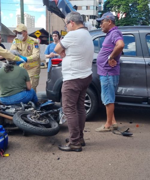 A colisão entre carro e moto ocorreu na Rua Mato Grosso esquina com Rua Olavo Bilac no Centro de Cascavel....