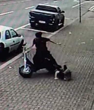 No vídeo, é possível ver a mulher saindo de um estabelecimento e acessando a calçada, quando acaba sendo atingida por um veículo elétrico autopropelido que...