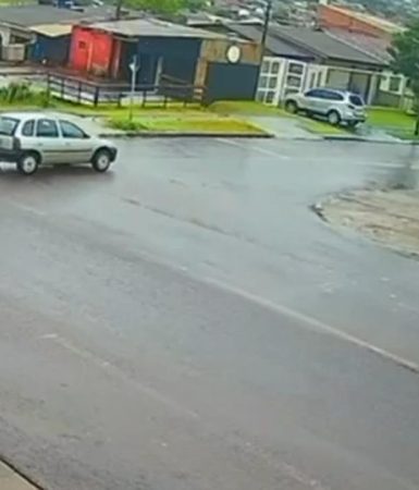 No vídeo é possível notar que uma moto e um Corsa seguiam por vias diferentes, quando o Corsa avança e colide contra a moto, ocupada pelo...