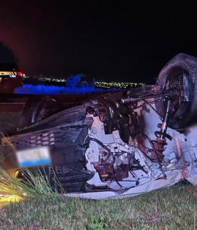 Fiat Strada capota após sair da pista na BR-163 em Cascavel