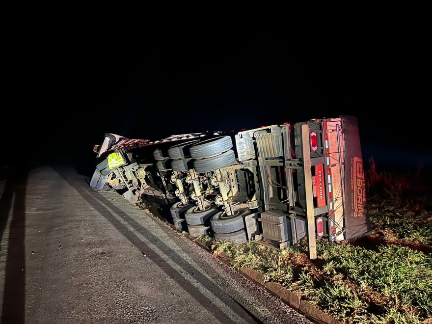 O tombamento de uma carreta foi registrado na tarde de quinta-feira (16) na rodovia PR-486, no município de Alto Piquiri, no Paraná.