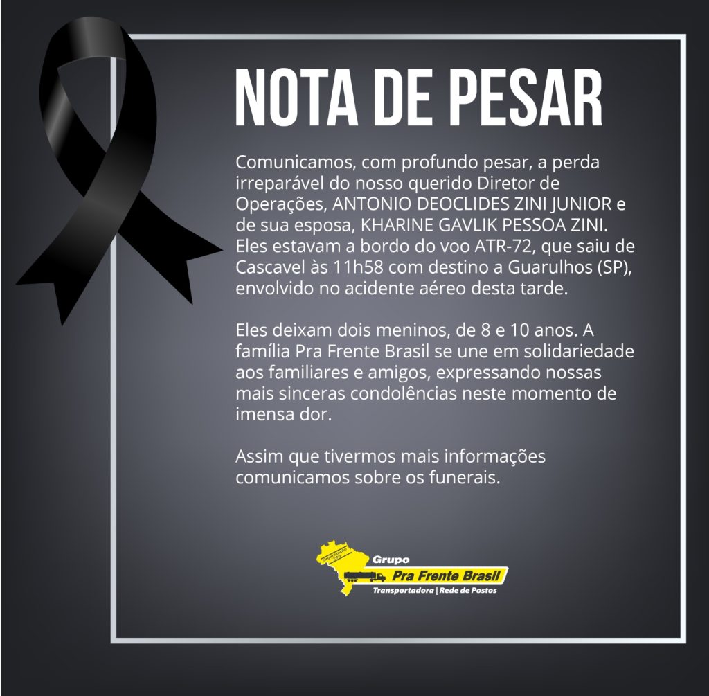 O diretor de Operações do Grupo Pra Frente Brasil, Antônio Deoclides Zini Junior e sua esposa Kharine Gavlik Pessoa Zini, estão entre os mortos na tragédia do voo 2283 da Companhia Aérea Voepass.