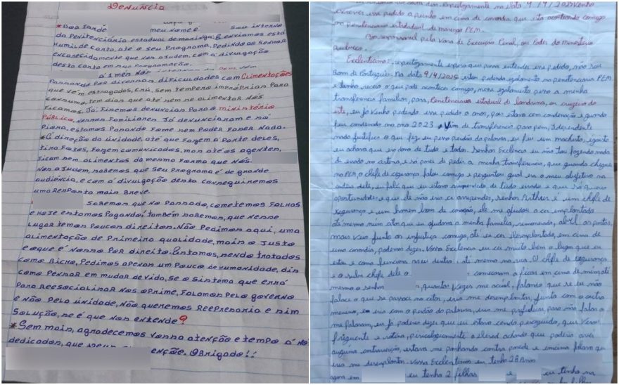 A primeira carta, escrita à mão, relata a situação de um detento que solicita transferência para outra penitenciária, alegando estar sendo vítima de assédio e injustiças por parte dos responsáveis pela segurança da PEM. O apenado, que não se identificou, disse que está há anos pedindo a transferência e que, apesar de reconhecer seus erros e se arrepender, sente-se perseguido e pressionado psicologicamente pelos chefes de segurança.