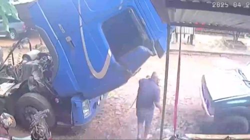Impressionante: Idoso é atingido por cabine de caminhão durante manutenção improvisada; veja vídeo