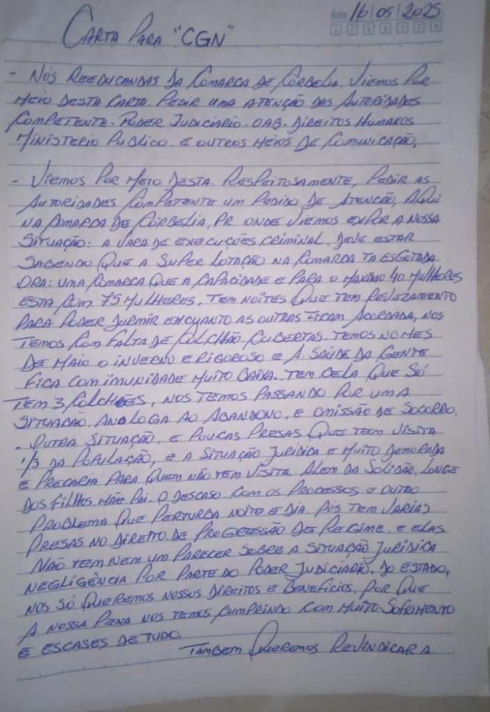 Nós reeducandas da Comarca de Corbélia, Viemos por meio desta carta pedir uma atenção das autoridades competentes, Poder Judiciário, OAB, Direitos Humanos, Ministério Público e outros meios de comunicação.