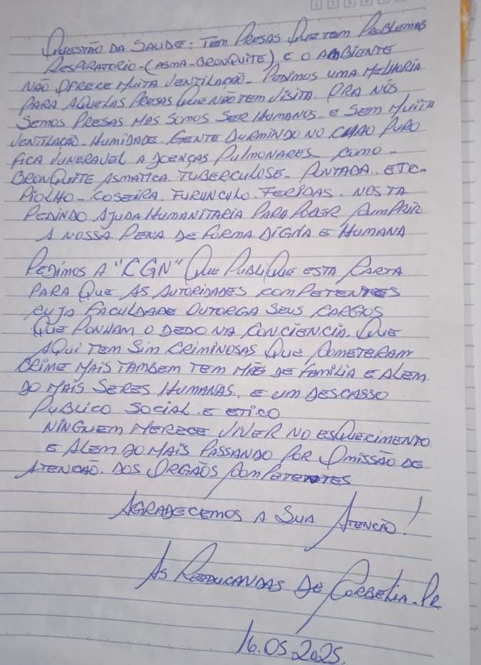 As presas solicitam, por fim, que a CGN publique a carta para que as autoridades competentes tomem conhecimento e medidas urgentes sobre a situação. “Ninguém merece viver no esquecimento e além do mais passando por omissão de atenção dos órgãos competentes”, conclui a carta.