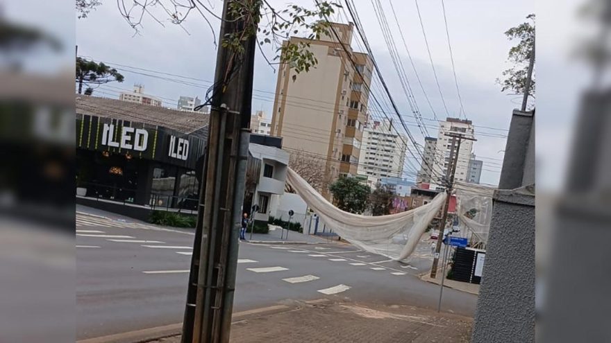 Na tarde deste domingo (27), uma tela de proteção utilizada em um prédio em construção se desprendeu na Rua Recife, nas proximidades da Rua Pio XII, no Centro de Cascavel. Em imagem enviada por um internauta é possível observar a tela atravessada na via, impedindo a passagem de veículos.