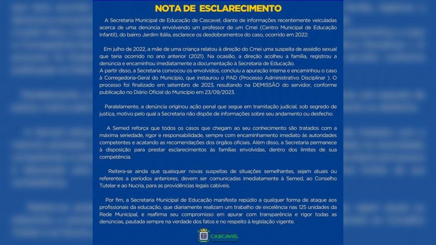 A Secretaria Municipal de Educação de Cascavel, diante de informações recentemente veiculadas acerca de uma denúncia envolvendo um professor de um Cmei (Centro Municipal de Educação Infantil), do bairro Jardim Itália, esclarece os desdobramentos do caso, ocorrido em 2022: