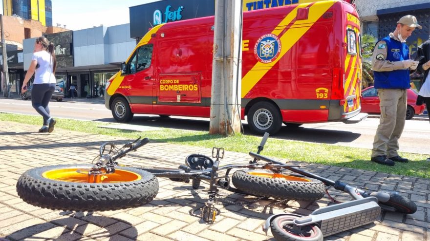 A colisão, entre uma bicicleta e um patinete elétrico, ocorreu no calçadão da Avenida Brasil, na esquina com a Rua Riachuelo.