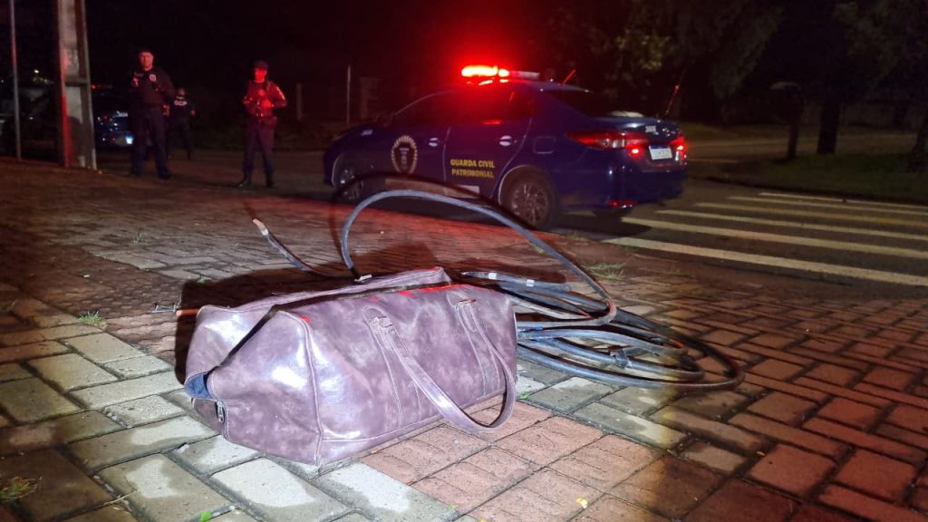 Ainda de acordo com os guardas, o suspeito teria pulado muro lateral, danificado o cano do poste e cortado cabos de energia com o objetivo de realizar o furto.