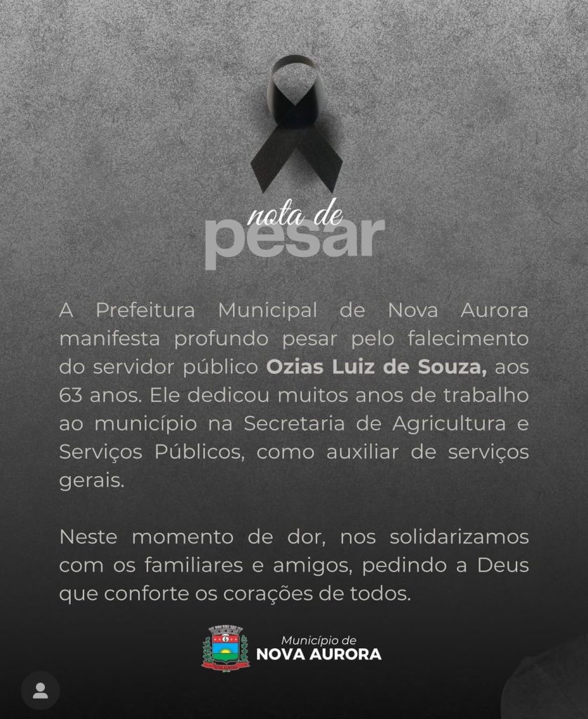 A Prefeitura de Nova Aurora também manifestou pesar pela morte de Ozias Luiz de Souza, emitindo uma nota lamentando a perda e reconhecendo sua dedicação ao serviço público municipal.