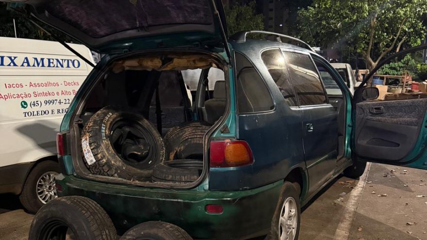 Durante um patrulhamento na região de fronteira, as equipes avistaram uma embarcação realizando a travessia do rio e descarregando volumes na margem brasileira. As forças de segurança se deslocaram imediatamente até o ponto indicado e encontraram uma perua Toyota, de placa paraguaia, carregada com 30 pneus de origem estrangeira.