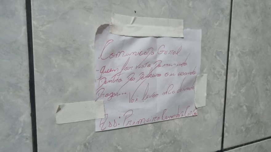 O bilhete, afixado no interior do banheiro, trazia a seguinte mensagem: “Comunicado Geral: Quem for visto dormindo dentro dos banheiros ou usando drogas… Vai levar madeirada. Ass: Primeiro Comando da Capital.”