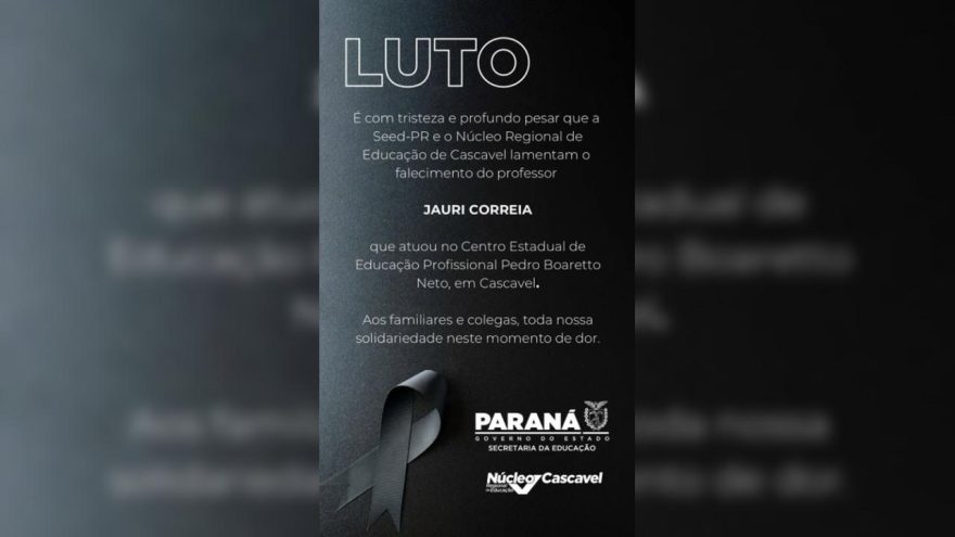 A Secretaria de Estado da Educação do Paraná (Seed-PR) e o Núcleo Regional de Educação de Cascavel emitiram, neste domingo (2), uma nota de pesar pelo falecimento do professor Jauri Correia.