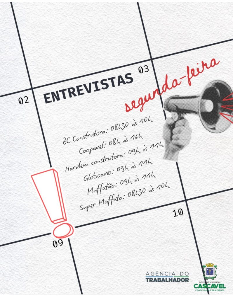 Os interessados nas vagas devem comparecer presencialmente na Agência do Trabalhador, que fica localizada na Rua Paraná, 3648. Contato pode ser feito pelo telefone (45) 3222-2284.