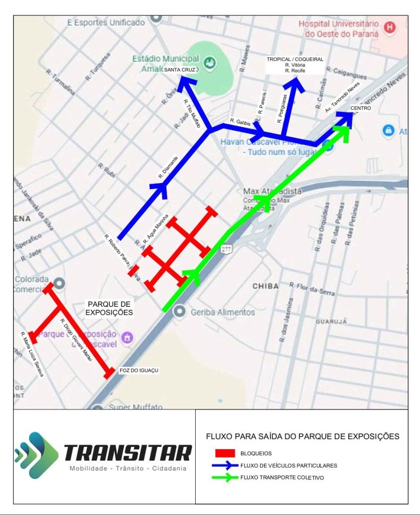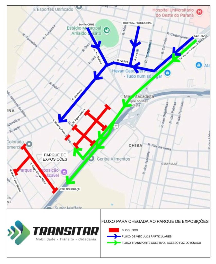 De acordo com a autarquia, haverá rotas específicas para veículos particulares e para o transporte coletivo. O acesso ao parque pelo transporte coletivo será feito pela Avenida Tancredo Neves, seguindo pela marginal até a Rua Roberto Paiva. Já os veículos particulares poderão chegar ao local exclusivamente pela Rua Gabilis, seguindo pela Rua Diamante até a Rua Roberto Paiva. O fluxo de saída ocorrerá pelas mesmas vias, em sentido inverso. O acesso à BR-277, no sentido Foz do Iguaçu, permanecerá liberado e poderá ser utilizado normalmente.