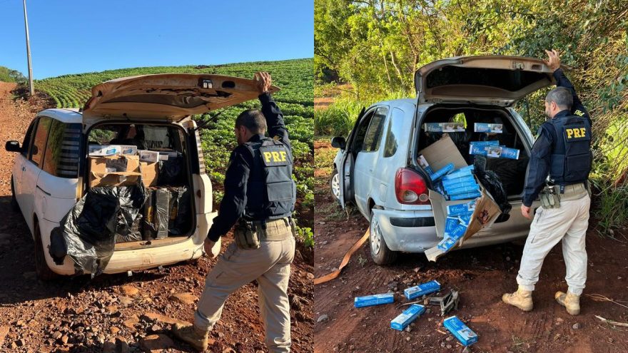Enquanto isso, outra equipe da PRF recebeu informações de populares sobre veículos paraguaios entrando em uma estrada rural próxima à rodovia. Ao chegar ao local, os policiais encontraram dois carros abandonados na mata, ambos carregados com grandes quantidades de cigarros de origem paraguaia.