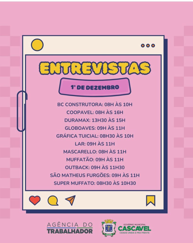 Os interessados nas vagas devem comparecer presencialmente na Agência do Trabalhador, que fica localizada na Rua Paraná, 3648. Contato pode ser feito pelo telefone (45) 3222-2284.