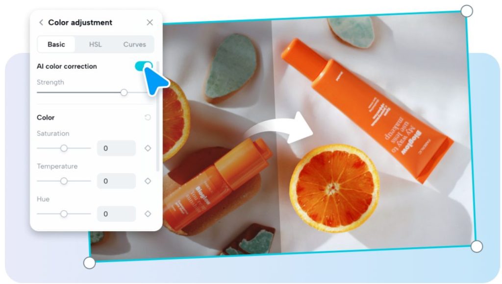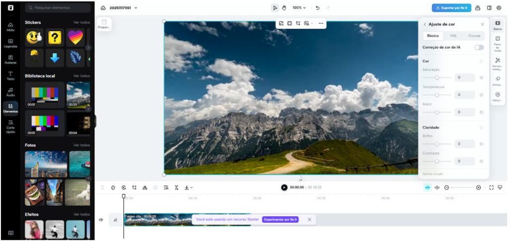 Na seção “Básico”, abra “Ajuste de cores” para começar a construir definição. Ative “Correção de cores com IA” para melhorar imediatamente a consistência tonal. Em seguida, ajuste Cor, Luminosidade, Curvas e HSL para reduzir o aspecto turvo típico de arquivos de baixo bitrate. Finalize o aprimoramento usando super-resolução para aumentar a nitidez percebida antes de salvar.