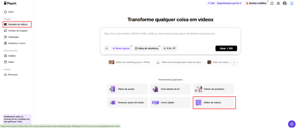 Entre na plataforma e acesse a área “Gerador de vídeos”. Abra o “Editor de vídeos” para começar a melhorar clipes de baixa qualidade.