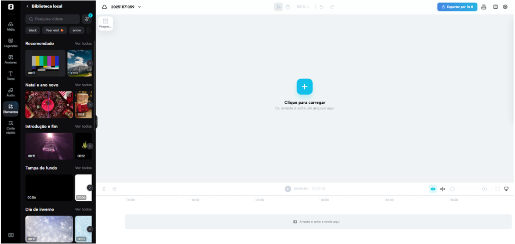 Envie o arquivo ou arraste-o até o local indicado. Caso não tenha material de teste, escolha um exemplo de baixo bitrate na aba “Elementos”.