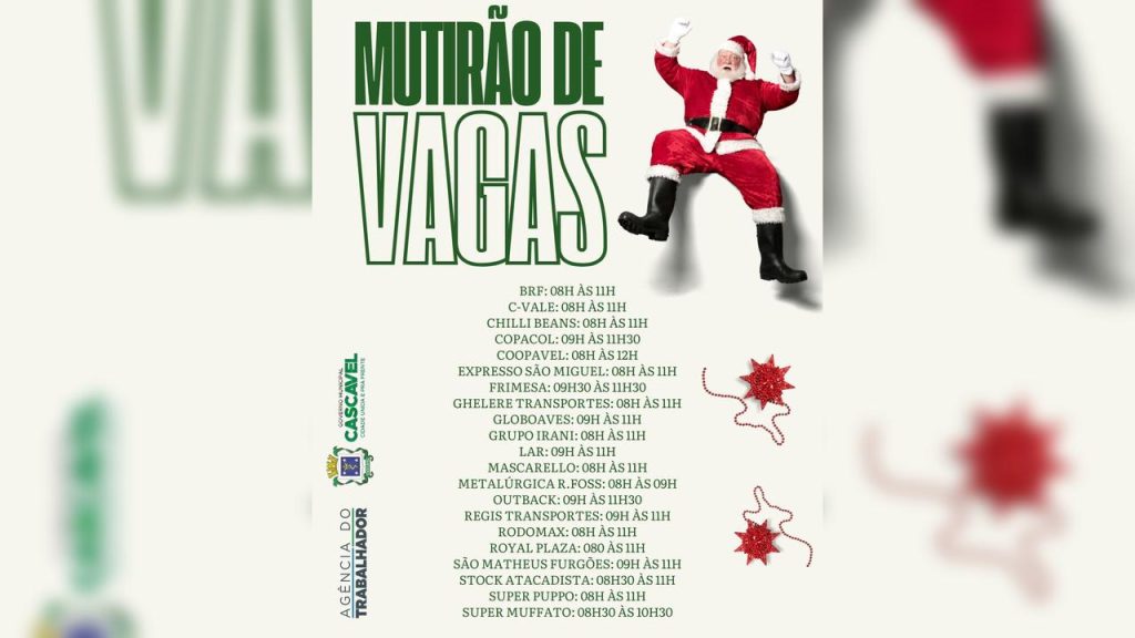 A Agência do Trabalhador de Cascavel realiza, nesta terça-feira (2), o último Mutirão de Vagas do ano. A ação especial concentra oportunidades de contratação imediata em diversas áreas e ocorre das 8h às 12h, na sede localizada na Rua Paraná, 3648, no Centro.