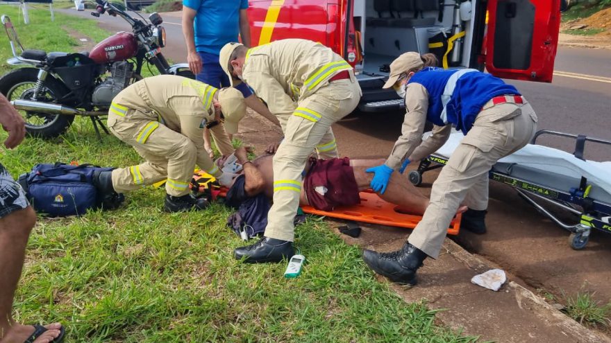 Um homem precisou do atendimento do Corpo de Bombeiros na tarde deste sábado (06) após ser vítima de um acidente de trânsito. A queda de moto ocorreu na Rua Jorge Lacerda, na entrada da cidade.
