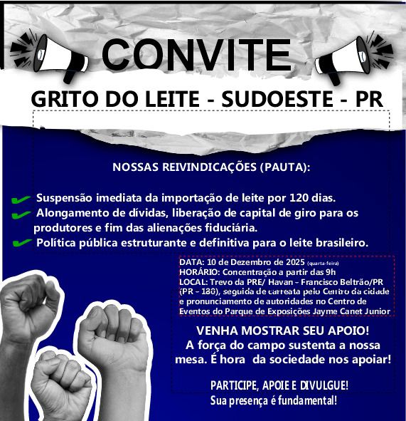 Entre as principais demandas dos produtores estão a suspensão das importações de leite por 120 dias, o alongamento de dívidas, a concessão de crédito para capital de giro e a criação de uma política pública permanente para o setor leiteiro. Mobilizações semelhantes também estão ocorrendo na rodovia BR-277, em Laranjeiras do Sul, onde os produtores buscam sensibilizar a população e o poder público para a gravidade do problema, que afeta não apenas a classe produtora, mas toda a sociedade.