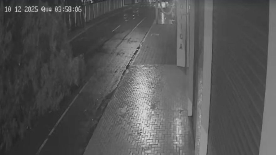 Uma câmera de segurança registrou imagens do momento em que uma árvore de grande porte cai na Rua Carlos de Carvalho, no Centro de Cascavel, na madrugada desta quarta-feira (10).