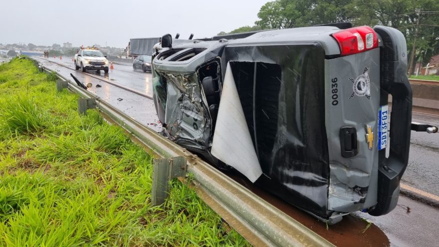 A viatura que capotou na tarde desta sexta-feira (12), próximo ao viaduto da BR-369, em Corbélia, era da Polícia Penal e estava com quatro policiais.