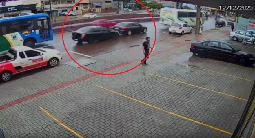 A CGN obteve acesso a imagens de câmera de segurança que mostram o exato momento em que ocorre uma colisão traseira entre um Ford Focus e um Chevrolet Cobalt na tarde desta sexta-feira (12) na Avenida Carlos Gomes.