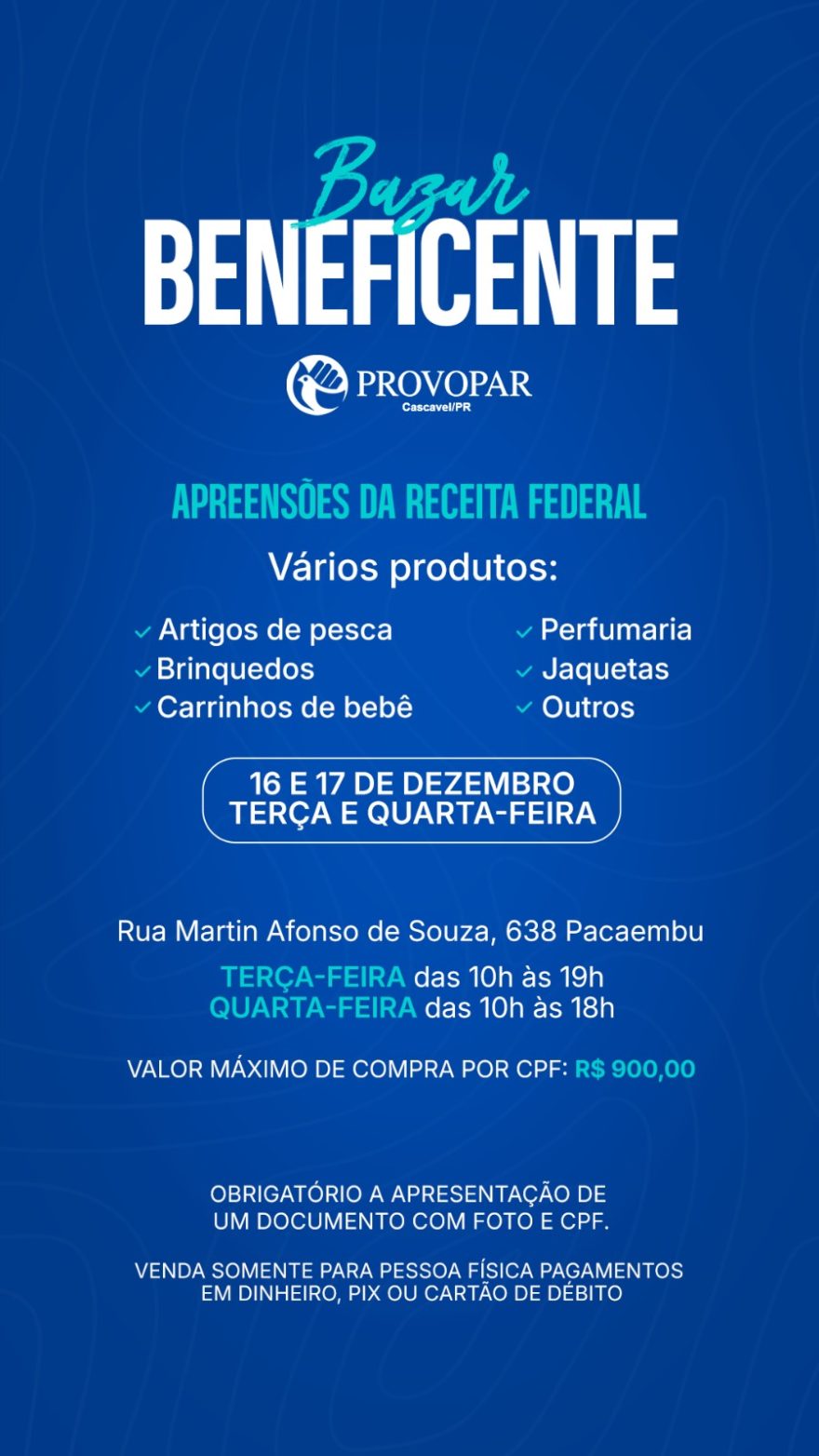 O Provopar de Cascavel marcou para os dias 16 e 17 de dezembro um bazar beneficente com produtos apreendidos pela Receita Federal. A ação será na sede da entidade, na Rua Martin Afonso de Souza, 638, no bairro Pacaembu.
