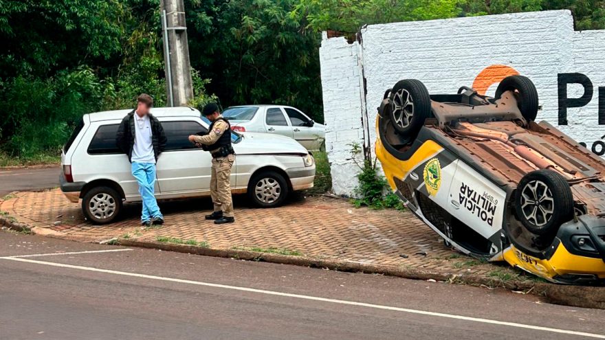 Viatura da PM capota após colisão com Fiat Uno em Cascavel