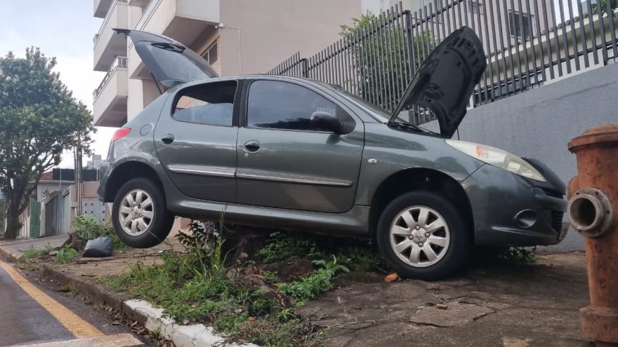 A motorista relatou ter enfrentado uma suposta falha no acionamento do freio. Diante da situação, o automóvel acabou invadindo a calçada e ficando preso em um toco de árvore.