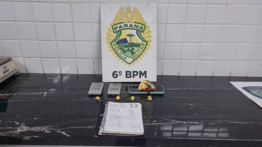 Durante a abordagem, os policiais localizaram com o suspeito 70 gramas de cocaína, duas balanças de precisão e um caderno de anotações.