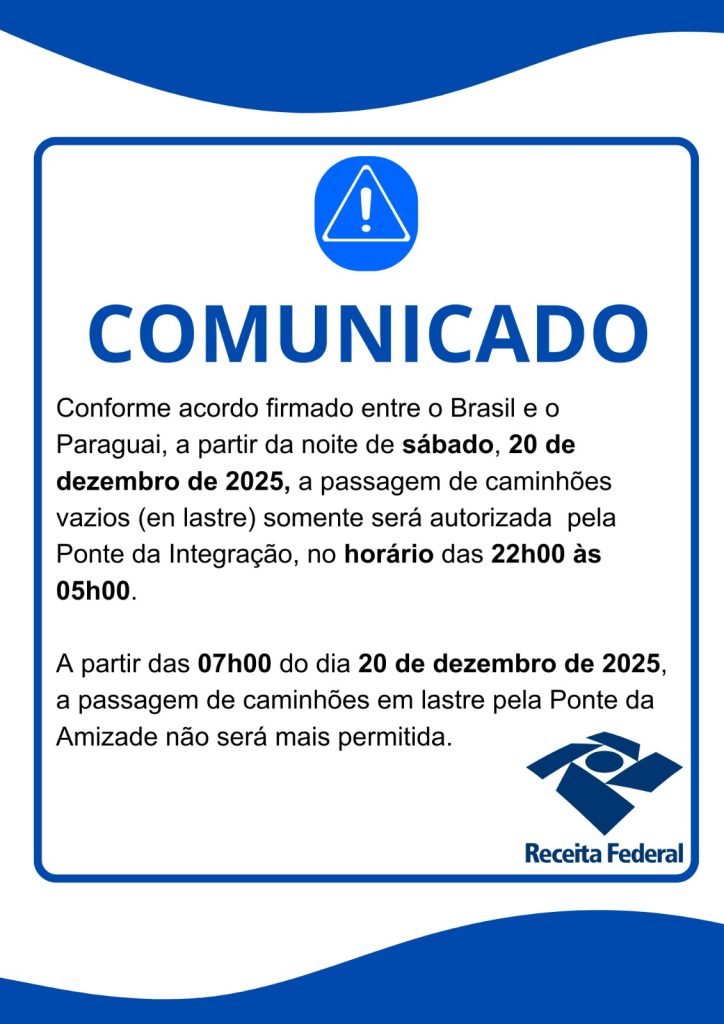 O comunicado destaca que, a partir das 7h de sábado (20), a passagem de caminhões vazios (en lastre) pela Ponte Internacional da Amizade não será mais permitida.