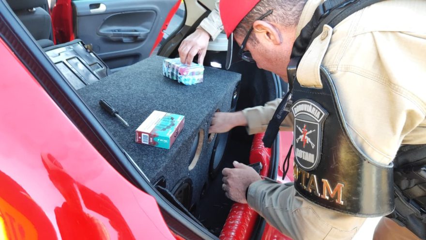 Durante a fiscalização, os policiais abordaram um VW Gol e, ao realizarem a vistoria no veículo, localizaram os cigarros eletrônicos escondidos dentro de uma caixa de som no bagageiro, numa tentativa de burlar a fiscalização.