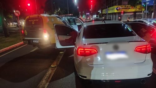 Na noite desta quinta-feira (25) a Patrulha Rural da Polícia Militar, em patrulhamento pela Avenida Brasil, em Cascavel, visualizou um veículo Jetta realizando, de forma proposital, descarga livre, oferecendo perigo às demais pessoas que estavam na rua e na calçada.