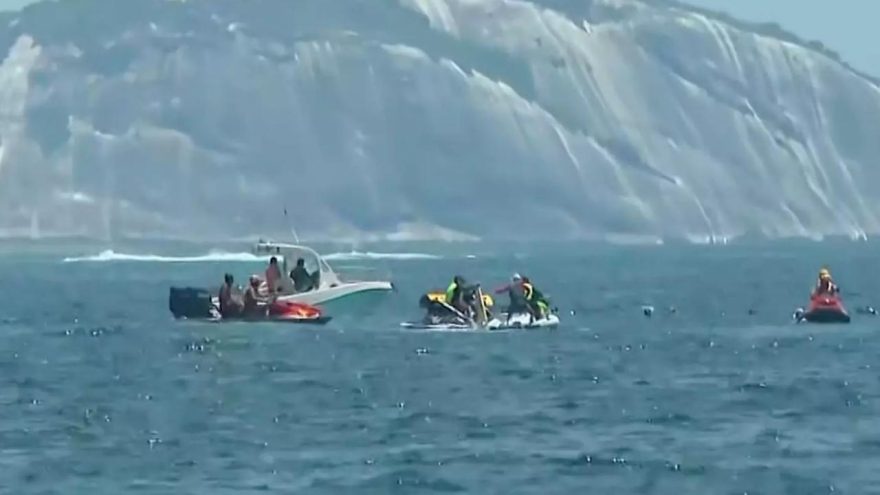 O Corpo de Bombeiros foi acionado às 12h34 e, desde então, está em operação no mar com o auxílio de helicópteros, barcos e motoaquáticas. A ocorrência está em andamento.