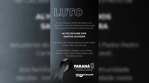 Em comunicado oficial, as instituições manifestaram tristeza e solidariedade diante da perda. “É com tristeza e profundo pesar que a Seed-PR e o Núcleo Regional de Educação de Cascavel lamentam o falecimento de Alyce Rayane dos Santos Oliveira, estudante do Colégio Estadual Padre Pedro Canisio Henz, de Cascavel. Aos familiares, colegas e comunidade escolar, toda nossa solidariedade neste momento de dor”, diz a nota.