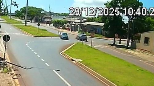 Uma câmera de segurança registrou imagens de um acidente de trânsito que ocorreu no cruzamento das ruas Poente do Sol e Guilherme Piovesan, no Bairro Brasmadeira em Cascavel, na manhã desta segunda-feira (29).