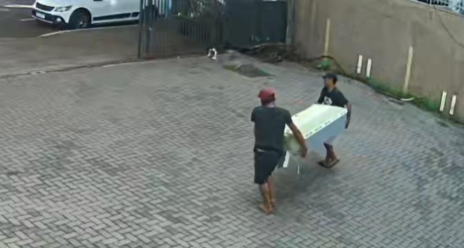No vídeo é possível notar que dois homens entram no imóvel e retiram um objeto que estava armazenado no local. Posteriormente eles carregam o item até um carrinho de recicláveis que estava na calçada e vão embora.