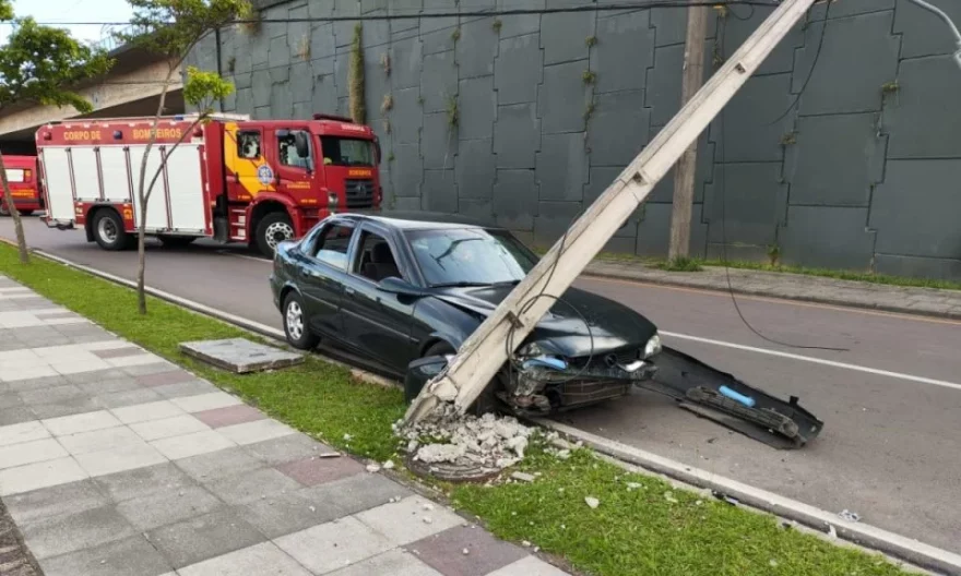 Um acidente envolvendo um automóvel e um poste de energia elétrica foi registrado na tarde desta sexta-feira (2) na via de acesso da Linha Verde à Avenida Comendador Franco, no bairro Jardim Botânico, em Curitiba. O incidente chamou a atenção de motoristas e pedestres pela situação de risco criada no local, já que o poste atingido ficou pendurado, sustentado apenas pela fiação, evitando uma queda completa sobre a pista.