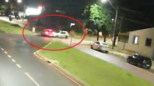 Imagens de câmera de monitoramento registraram uma colisão entre dois carros na noite deste domingo (18) no Bairro Brasmadeira, em Cascavel.