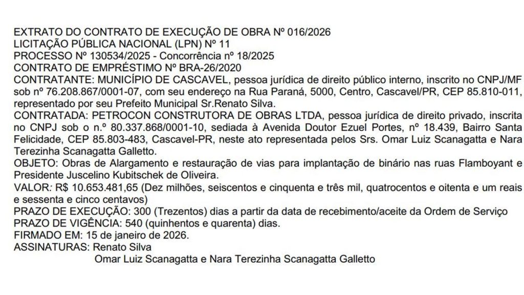 A Prefeitura de Cascavel firmou contrato com a empresa Petrocon Construtora de Obras Ltda. para a execução de obras de alargamento e restauração das ruas Flamboyant e Presidente Juscelino Kubitschek de Oliveira. O objetivo é viabilizar a implantação de um sistema binário nessas vias, medida que visa aprimorar a fluidez do trânsito e a mobilidade urbana na região contemplada.