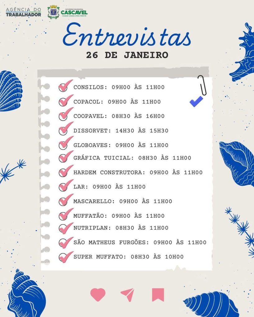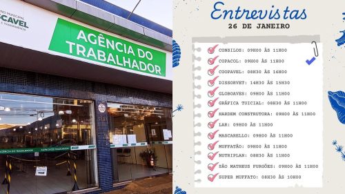 Os interessados nas vagas devem comparecer presencialmente na Agência do Trabalhador, que fica localizada na Rua Paraná, 3648. Contato pode ser feito pelo telefone (45) 3222-2284.