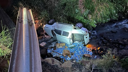 Em determinando momento, quando cruzava uma pequena ponte de estrada vicinal que havia adentrado, o veículo saiu da pista, rompendo o parapeito e vindo a cair no rio, abaixo da ponte, espalhando a carga de cigarro, causando ainda dano ambiental e ao patrimônio publico. O condutor evadiu-se na mata fechada adjacente.
