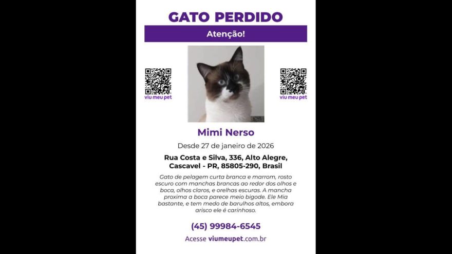Gato Mimi Nerso desapareceu no bairro Alto Alegre