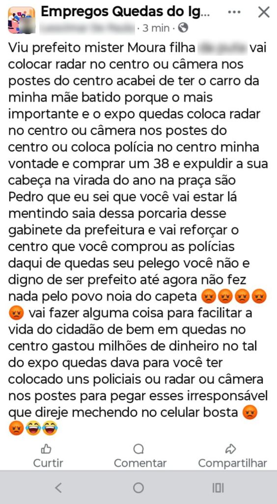 A publicação ocorreu na noite do dia 3 de novembro de 2025, em um grupo público do Facebook, e continha ofensas e uma ameaça grave, o que motivou a intervenção imediata da Polícia Civil. O conteúdo extrapolou qualquer limite aceitável de manifestação, mas teve origem em críticas direcionadas à atuação do poder público.