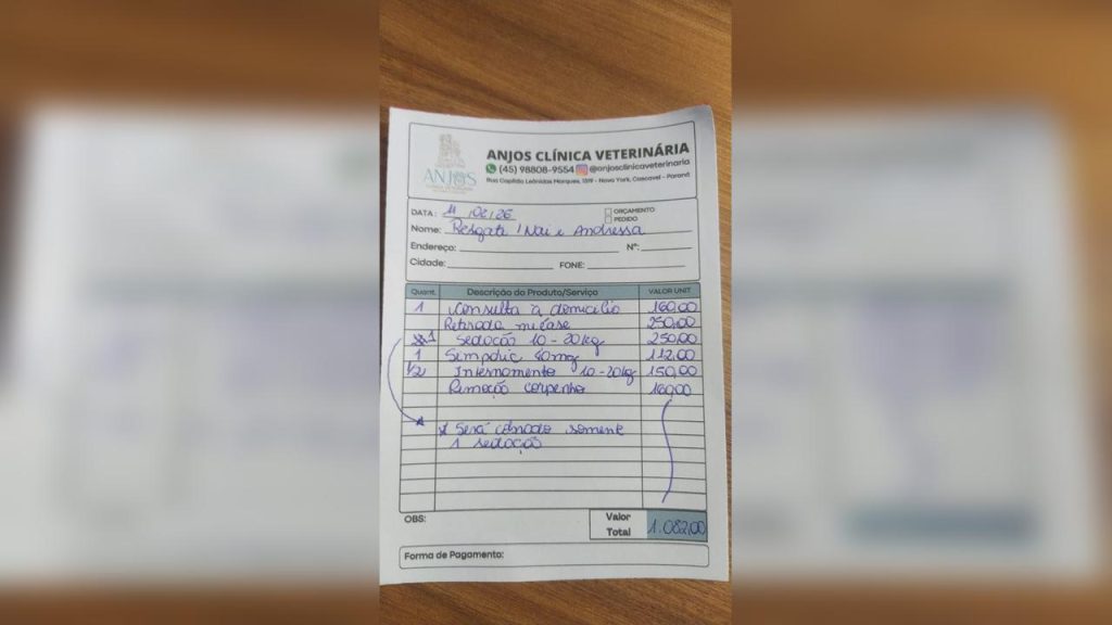 A conta na clínica veterinária ficou em R$ 1.082,00 e agora, os populares que tentaram ajudar o animal, precisam de ajuda para quitar a dívida.